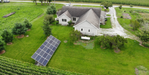 A ground mound solar array is in the backyard of a single family home. The photo was taken by a drone